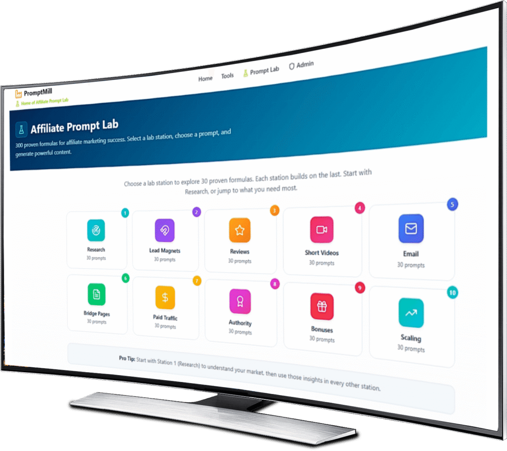 Using Affiliate Prompt Lab is refreshingly straightforward, almost like following a recipe for success. Imagine sitting down with a cup of coffee, logging in, and cranking out a month’s worth of content in an afternoon. That’s the reality here. You start on the dashboard, where 10 core “stations” handle different parts of your workflow – from research to scaling: